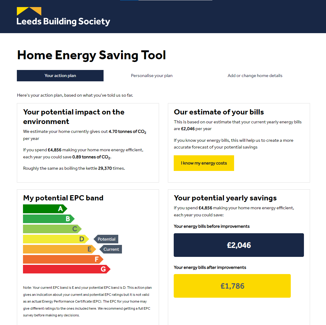 Backed by the latest data, Leeds Building Society helps customers assess the energy performance of their homes. Customers get a tailored action plan with practical advice to make their homes more energy efficient. They can personalise it further by matching it to their motivations and budget.